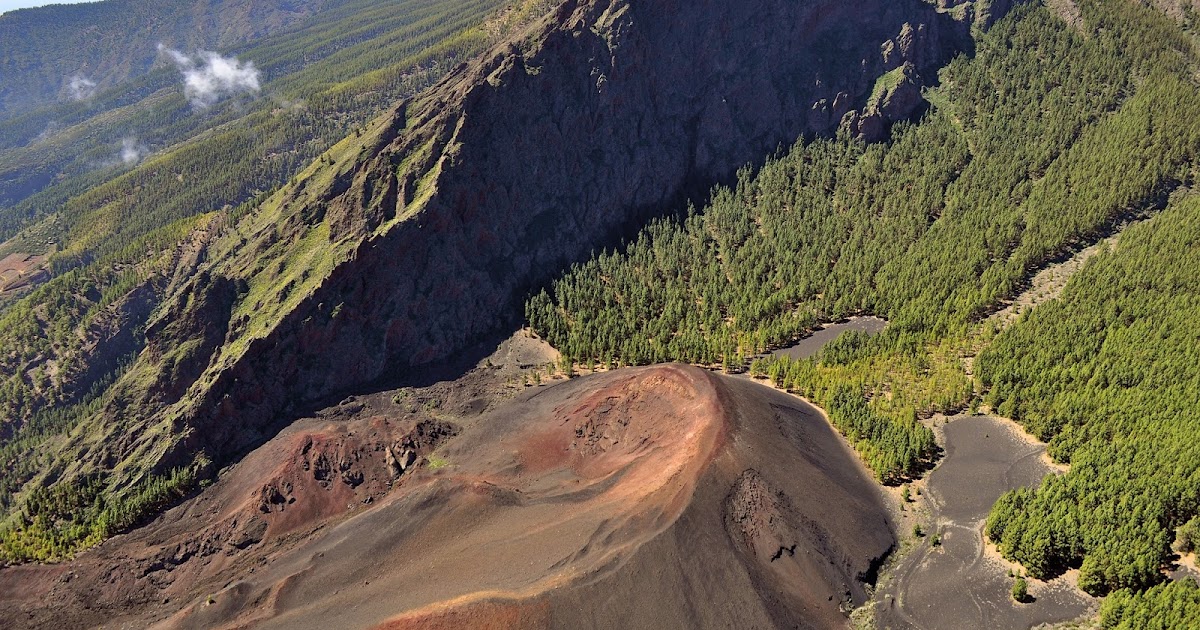 Volcán de Arafo en la degollada de Pedro Gil. Vista aérea del volcán de la degollada de Pedro Gil al pie de Cho Marcial, en el munici...